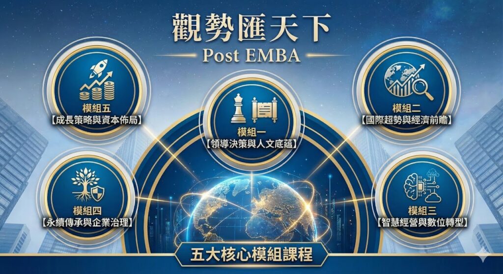 「觀勢匯天下」以視野與洞察、趨勢與應變、匯聚與流通為核心精神,由淡江大學菁英會與推廣教育處攜手於2025年6月間強勢推出。本課程著眼於現代商業環境中的趨勢洞察與實戰能力提升。課程致力於幫助學員掌握局勢變化、有效整合資源,並以宏觀視野與實務能力,在競爭激烈的市場中脫穎而出,成為企業領航者。